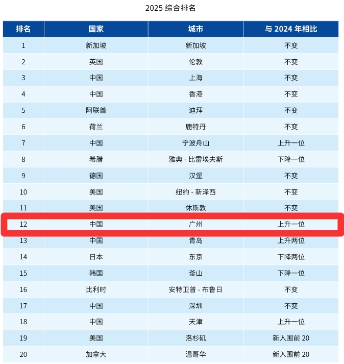 近日,《新华·波罗的海国际航运中心发展指数报告(2025)》(以下简称“《报告》”)对外发布。《报告》显示,广州超越东京位居全球第12位,与2024年位次(第13位)相比上升了1位,在中国区排名中仅次于上海、香港、宁波舟山,位居全国第4位,彰显出广州国际航运枢纽建设取得新成效,全球影响力和航运资源配置能力进一步提升。