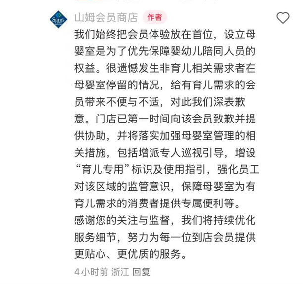 山姆会员商店官方账号对母婴室遭到男子占用一事进行了回应。小红书截图