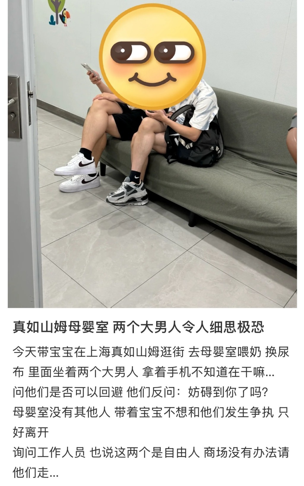 网友发帖称母婴室沙发被两位男子占用。小红书截图