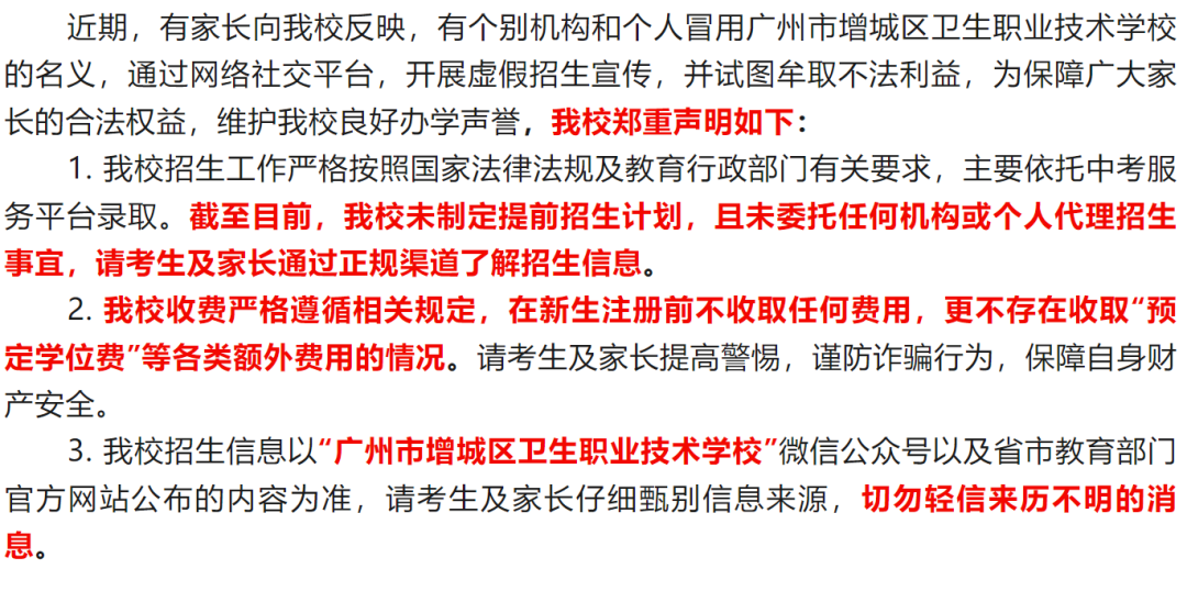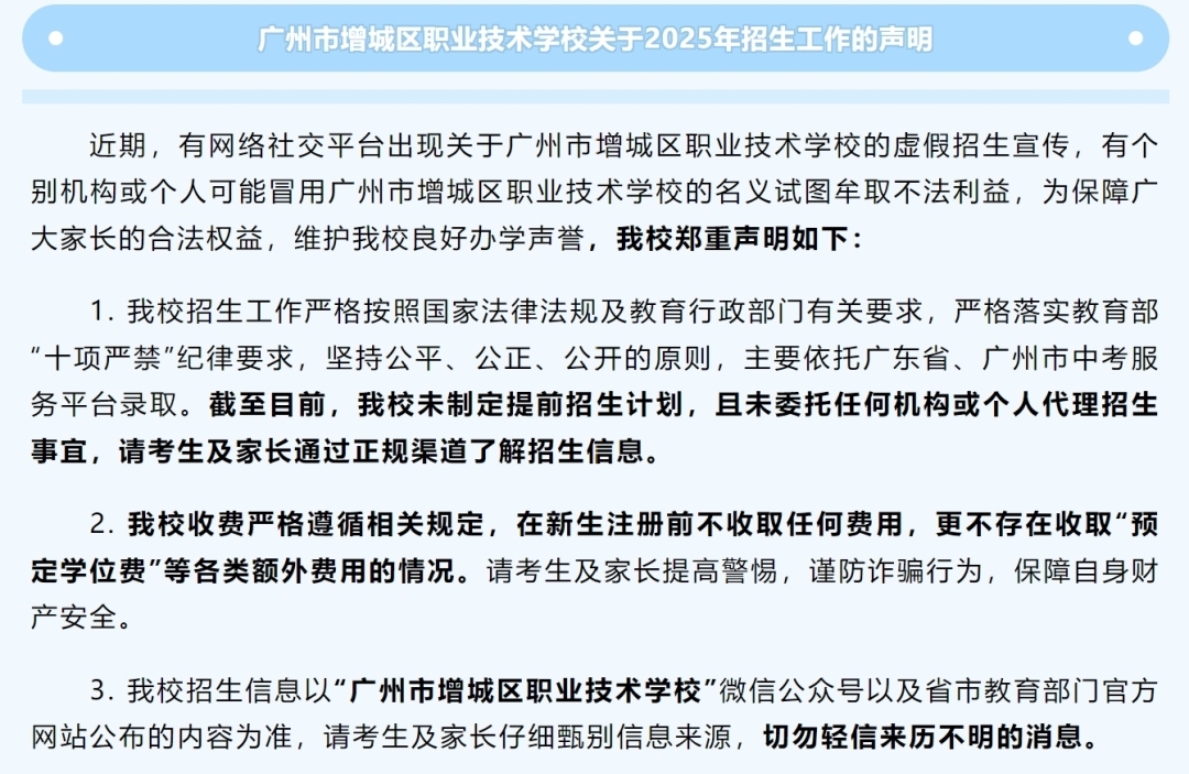 广州市增城区职业技术学校、广州市增城区卫生职业技术学校均称,学校收费严格遵循相关规定,在新生注册前不收取任何费用,更不存在收取“预订学位费”等各类额外费用的情况。请考生及家长提高警惕,谨防诈骗行为,保障自身财产安全。