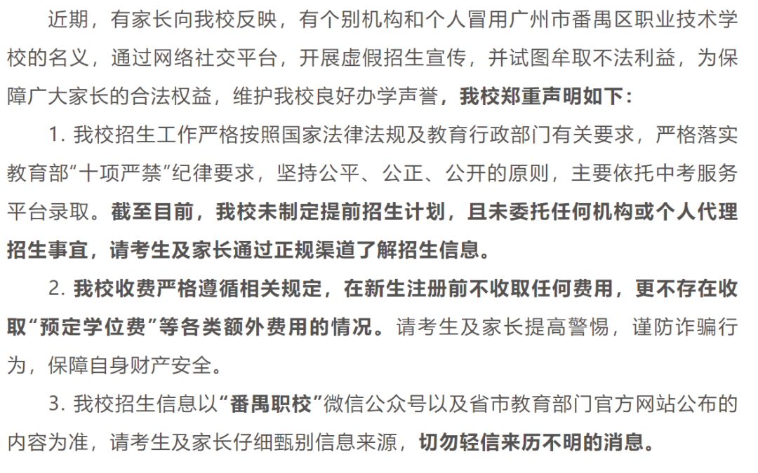 广州市番禺区职业技术学校表示,近期,有家长向学校反映,有个别机构和个人冒用学校的名义,通过网络社交平台,开展虚假招生宣传,并试图牟取不法利益。该校说,截至目前,学校未制定提前招生计划,且未委托任何机构或个人代理招生事宜,请考生及家长通过正规渠道了解招生信息。