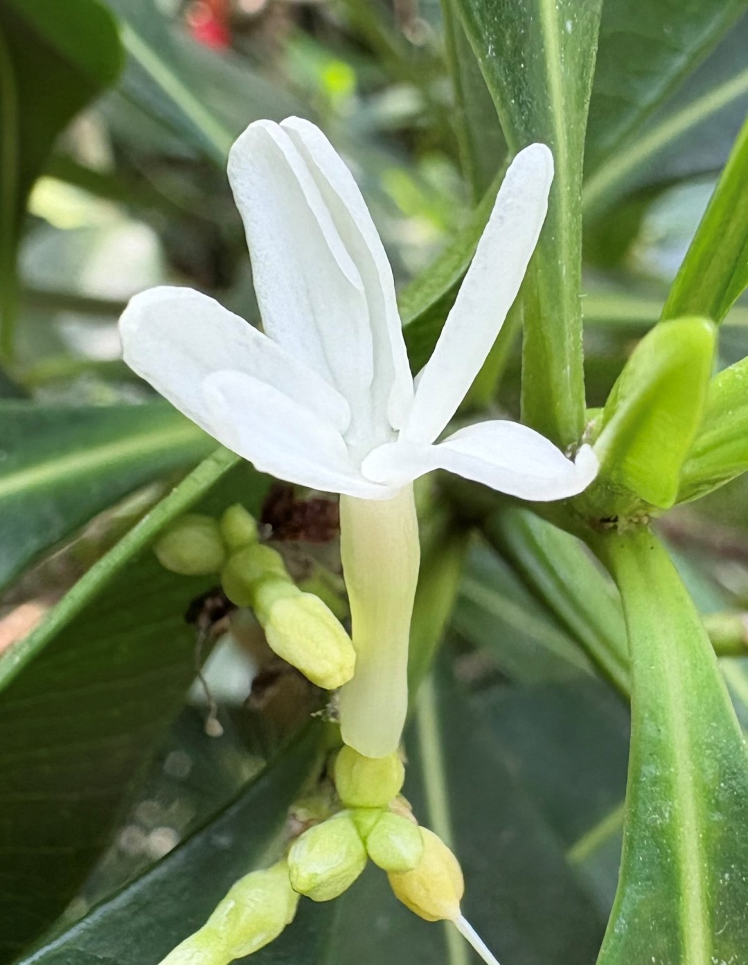 据介绍,古城玫瑰树虽属夹竹桃科玫瑰树属,但与常见的玫瑰花截然不同。其花朵为白色高脚碟状,直径约1.5厘米,由数十朵小花组成紧凑的伞状花序,散发淡雅香气。最令人称奇的是其果实——成熟时呈玫瑰红色的椭圆形核果,通常成对生长,两颗心形果实紧密相连,宛若“同心结”,被赋予“同心连理,爱意天成”的美好寓意。