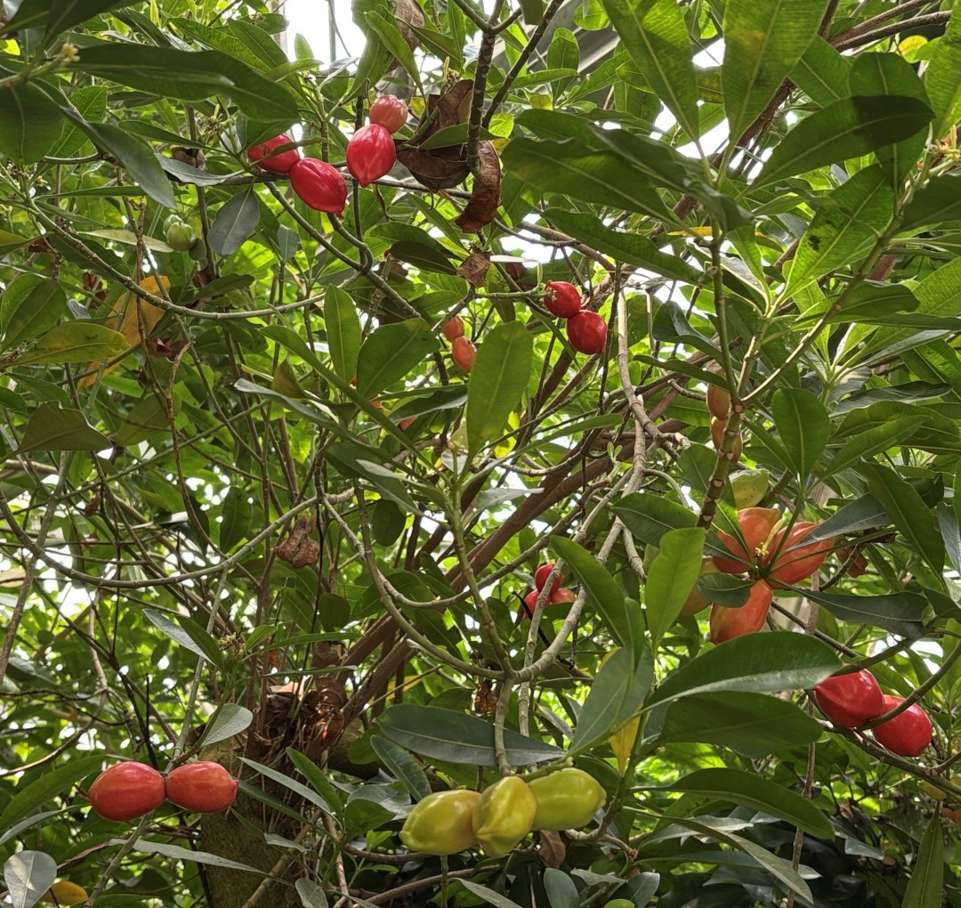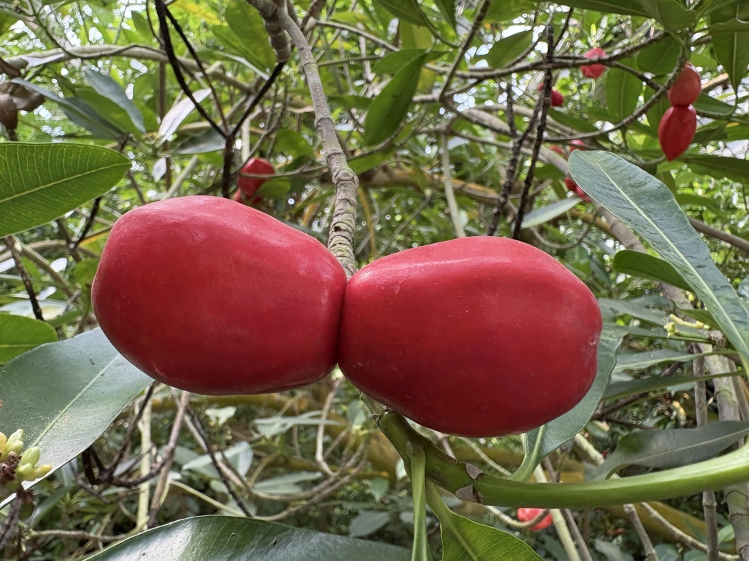 近日,华南国家植物园热带雨林温室内,一种名为古城玫瑰树的植物挂满形似“红心结”的奇特果实,吸引了众多游客驻足观赏。这种来自澳大利亚的常绿小乔木,以其独特的“同心双果”造型和浪漫寓意成为园区新晋“网红”。