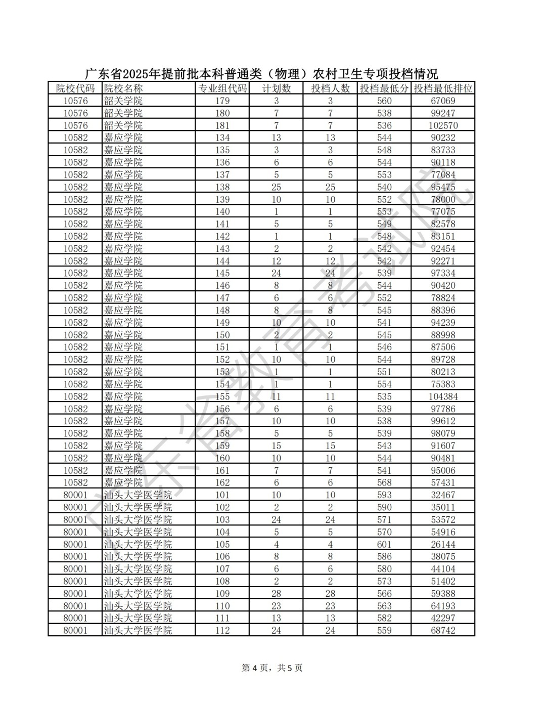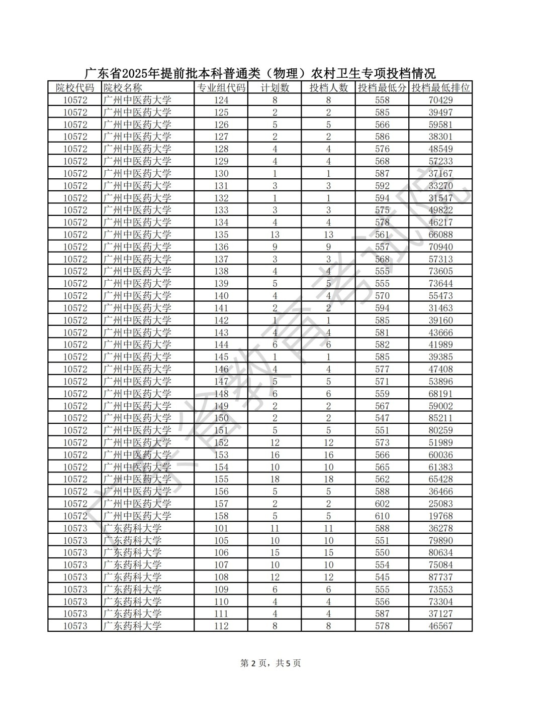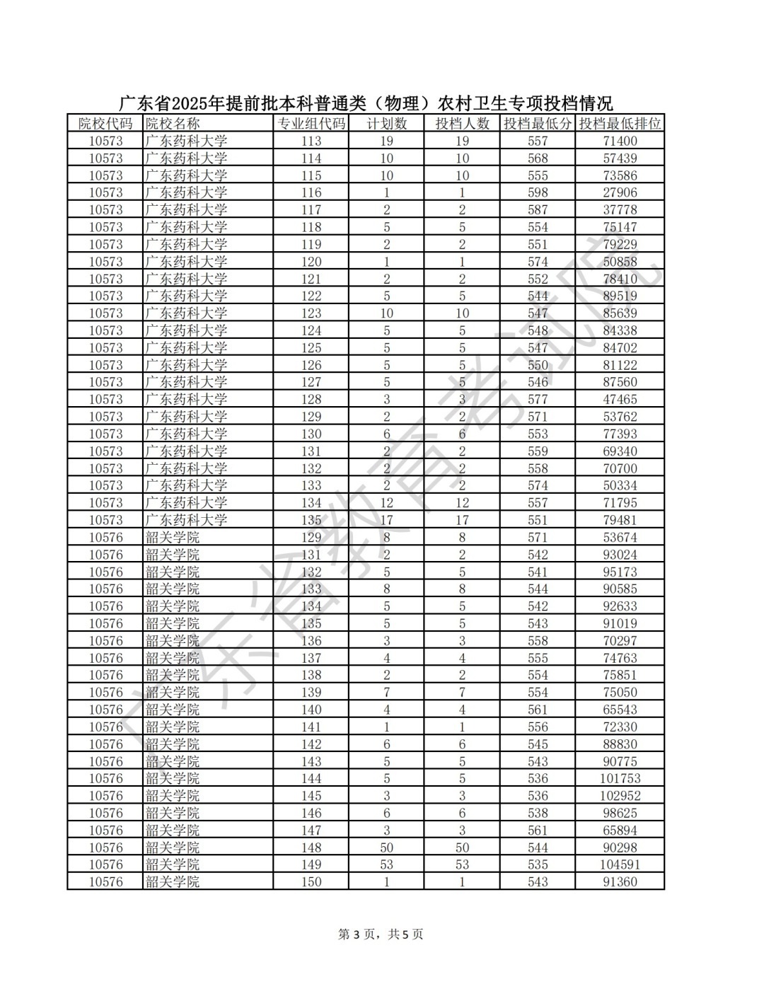 物理类投档情况显示,广州中医药大学158专业组610分,投档最低排位19768,夺得榜首。第2至第10位依次是:广州中医药大学157专业组(602分,投档最低排位25083),广州中医药大学102专业组(601分,投档最低排位25692),汕头大学医学院105专业组(601分,投档最低排位26144),广东药科大学116专业组(598分,投档最低排位 27906),广东医科大学106专业组(597分,投档最低排位29002),广州中医药大学120专业组(596分,投档最低排位29889),广东医科大学107专业组(595分,投档最低排位30827),广州中医药大学115专业组(595分,投档最低排位30884),广州中医药大学141专业组(594分,投档最低排位31463)。韶关学院149专业组最低投档分535,投档最低排位104591,为该批次物理类卫生专项的最低分,超出特控线1分。