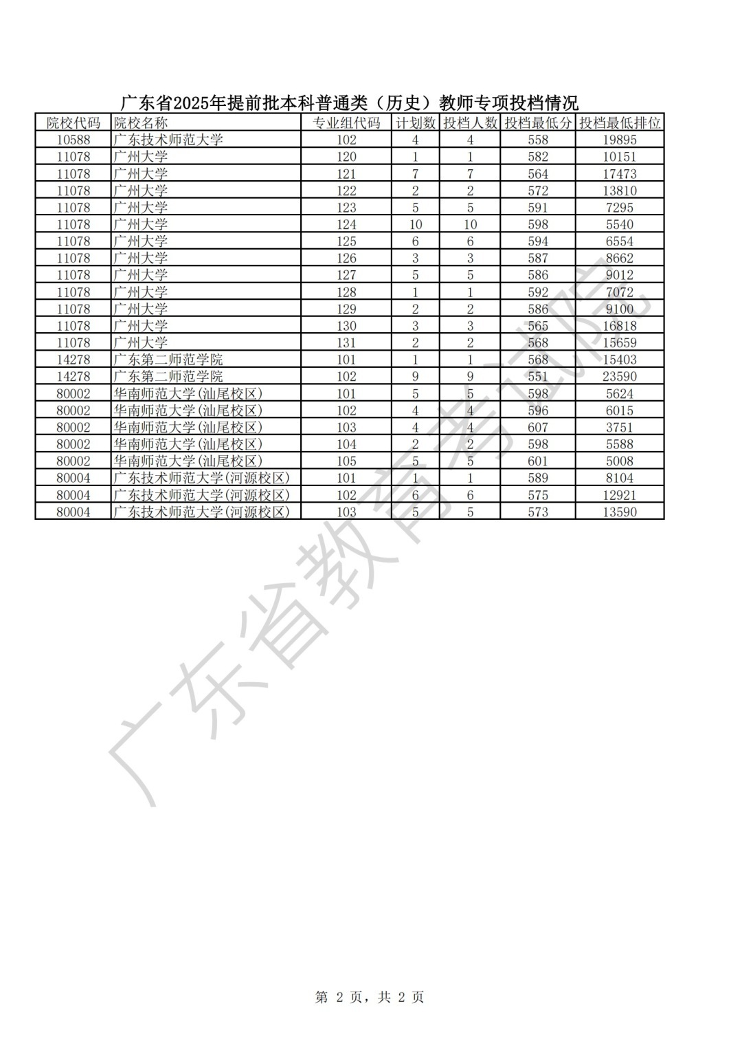最低投档分方面,历史类10强中,华南师范大学表现强势。第1至第10位依次为:华南师范大学(汕尾校区)103专业组(607分,投档最低排位3751),华南师范大学(汕尾校区)105专业组(601分,投档最低排位5008),广州大学124专业组(598分,投档最低排位5540),华南师范大学(汕尾校区)104专业组(598分,投档最低排位5588),华南师范大学(汕尾校区)101专业组(598分,投档最低排位5624),华南师范大学(汕尾校区)102专业组(596分,投档最低排位6015),广州大学125专业组(594分,投档最低排位6554),广州大学128专业组(592分,投档最低排位7072),广州大学123专业组(591分,投档最低排位7295),岭南师范学院104专业组(590分,投档最低排位7756)。嘉应学院119专业组最低投档分540分,投档最低排位29810,为该批次历史类教师专项的最低分,超出本科线76分。