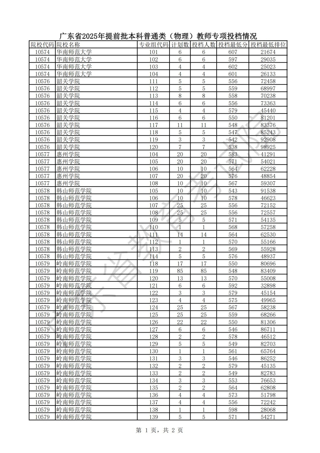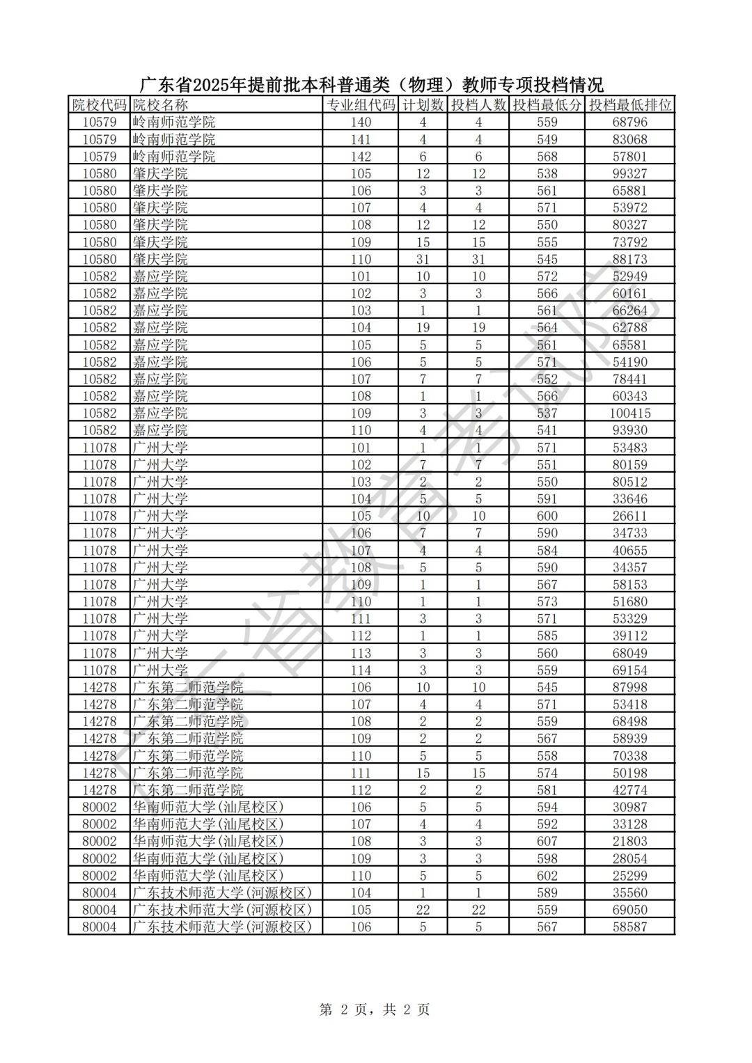 物理类最低投档分方面,第1至第10位分别为:华南师范大学101专业组(607分,投档最低排位21674),华南师范大学(汕尾校区)108专业组(607分,投档最低排位21803),华南师范大学103专业组(602分,投档最低排位25023),华南师范大学(汕尾校区)110专业组(602分,投档最低排位25299),华南师范大学104专业组(601分,投档最低排位26133),广州大学105专业组(600分,投档最低排位26611),岭南师范学院138专业组(598分,投档最低排位28068),华南师范大学102专业组(597分,投档最低排位29035),华南师范大学(汕尾校区)106专业组(594分,投档最低排位30987),岭南师范学院121专业组(592分,投档最低排位32898)。嘉应学院109专业组最低投档分537分,投档最低排位100415,为该批次物理类教师专项的最低分,超出特控线3分。