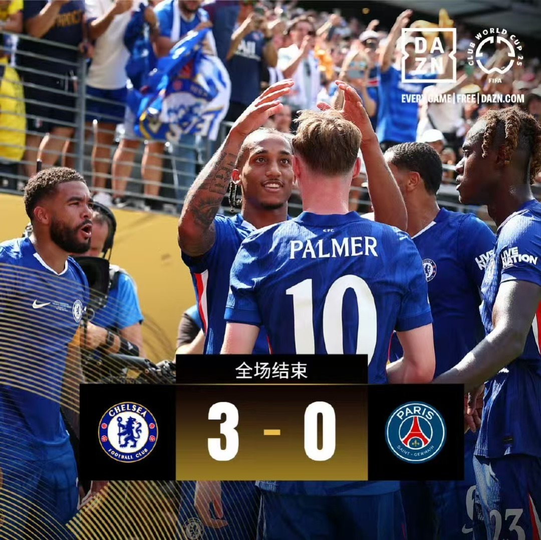 北京时间今晨,历时一个多月共63场比赛之后,2025年世俱杯在美国落下大幕,在决赛中,今年的欧协杯冠军切尔西以3比0战胜今年的欧冠冠军巴黎圣日耳曼问鼎。帕尔默8分钟内连下两城,此后又助攻若昂·佩德罗破门,切尔西在上半场就打进3球奠定胜局,而“大巴黎”的若奥·内维斯最后时刻还因报复性动作吃到红牌被罚下,英超“蓝狮”夺得改制后的首届世俱杯冠军,这也是切尔西第二次赢得世俱杯冠军。
