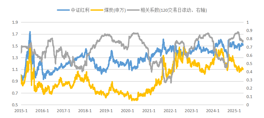 中证红利指数、煤炭股、中证红利与银行股走势相关系数的对比