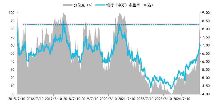 经历持续上涨后,当前银行业整体估值水平有所抬升,其滚动市盈率处于近10年的83%分位,正在逼近2018年和2021年的高点。短期来看,估值修复带来的快速上涨或将放缓,股价波动也可能随之加大。