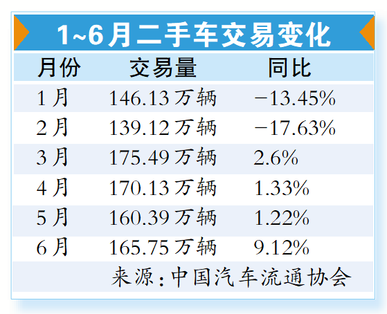 中国汽车流通协会的最新数据显示,今年1~6月,二手车累计交易量957.01万辆,同比增长1.99%,与新车市场10%的增速相比存在明显差距。其中5月份二手车交易量环比下降5.72%,同比增长仅为1.22%,6月份略微回升,环比增长3.34%,但整体来看,市场增速平缓。肖政三分析认为:“新车市场白热化竞争使得二手车商经营压力陡增,行业整体利润率持续下滑。”