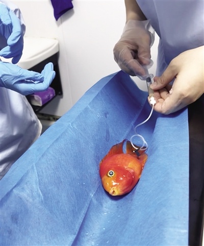 吴志坤为鹦鹉鱼“凸凸”做穿刺手术。
