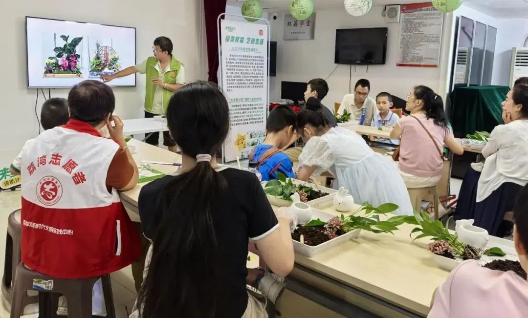 在实践环节,亲子家庭分工协作,家长负责稳固容器,孩子专注植物排列与色彩搭配,现场洋溢着温馨和谐的合作氛围。导师即时答疑解惑,并送上精心准备的“植物养护小锦囊”,确保这份从课堂带回家的“绿色”能够长久陪伴成长。