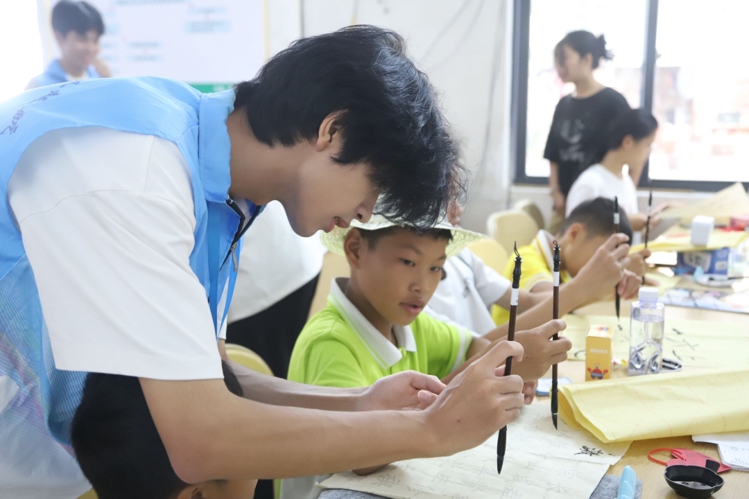 大塘村的书法课上,墨香伴着夏风远播。志愿者从“梦”字教起:上面的“林”是众人协作,下面的“夕”是珍惜当下;写“勇”字时,讲述消防员逆行的无畏故事;练“行”字时,聊聊村里修路工人的执着坚守。志愿者还结合乡村实际,将资助宣传融入课堂,通过“如果学费有困难,国家有哪些帮助”“怎样才能申请助学金”等互动问答,把资助政策讲得清晰透彻,让温暖的政策春风吹进孩子们心田。