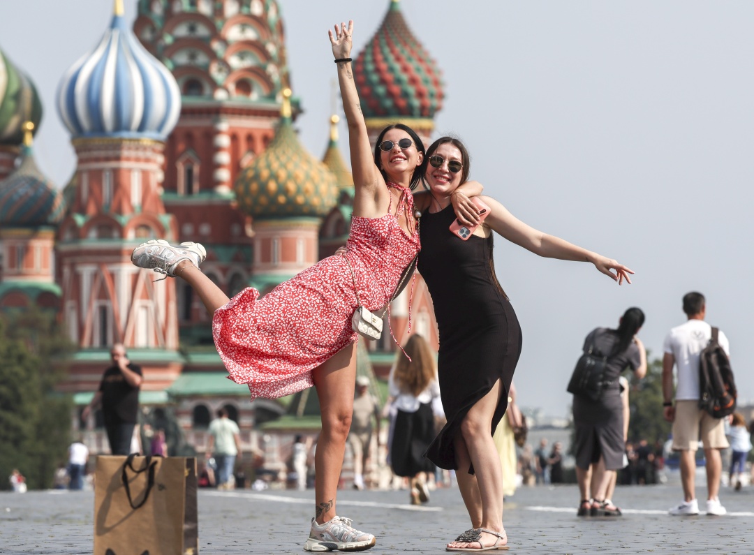 7月9日,在俄罗斯莫斯科,两名女子在圣瓦西里大教堂前拍照。莫斯科地区近期气温达到30摄氏度。新华社/欧新