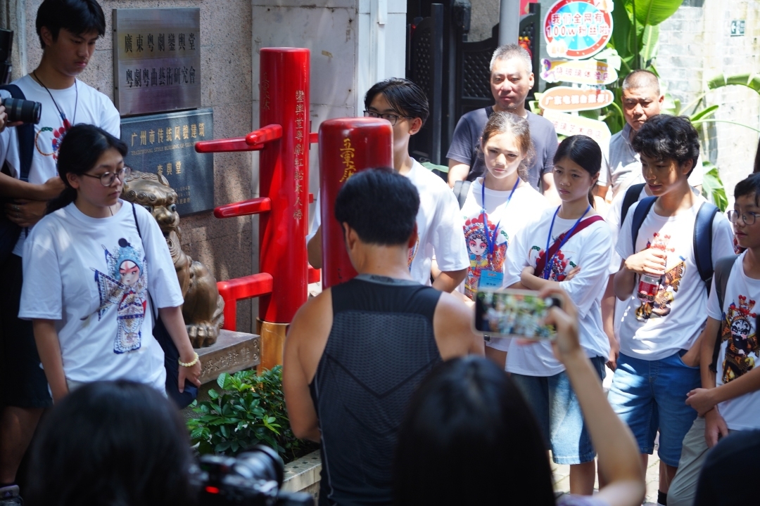 开营首日上午,学员们探访粤剧文化地标——广东八和会馆、广东銮舆堂和粤剧艺术博物馆。他们在专业讲解中溯源粤剧历史,在练功房内体验木人桩风采。下午的粤剧表演体验环节更是高潮迭起,从唱腔打磨到水袖翩跹,学员们在专业指导下沉浸式感受粤剧艺术精髓。“原来粤剧妆容要画这么久!”一位正在体验粤剧妆造的小营员惊叹道。专业化妆师一边为其上妆,一边讲解不同行当的妆容特点,吸引众营员围观学习。