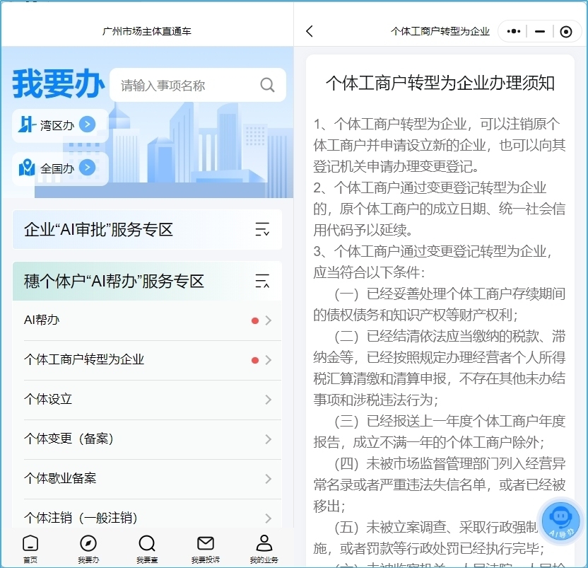 即日起,广州市个体工商户设立无须填表,个转企可直接变更掌上办!广州市市场监管局依托“广州市开办企业一网通平台”微信小程序,上线穗个体户“AI帮办”服务专区,创新推出“AI帮办”智能填报和“个体工商户转型为企业”掌上直接变更两大功能,以人工智能技术打破传统登记难点堵点,推动个体工商户设立、转型升级便利化,进一步完善注册登记智能服务全覆盖,为市场经营主体发展注入新活力。