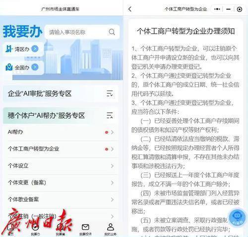 上线穗个体户“AI帮办”服务专区,创新推出“AI帮办”智能填报和“个体工商户转型为企业”掌上直接变更两大功能。
