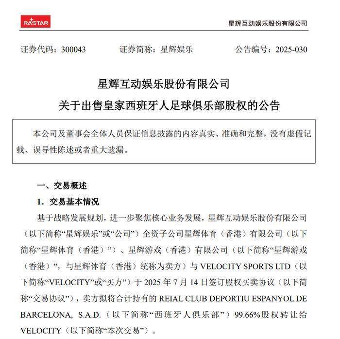 本次交易完成后,VELOCITY将持有西班牙人俱乐部99.66%股权,星辉游戏(香港)、星辉体育(香港)合计持有VELOCITY 38.26股A类股份,占VELOCITY总股本的16.45%。该交易尚需提交股东大会审议。