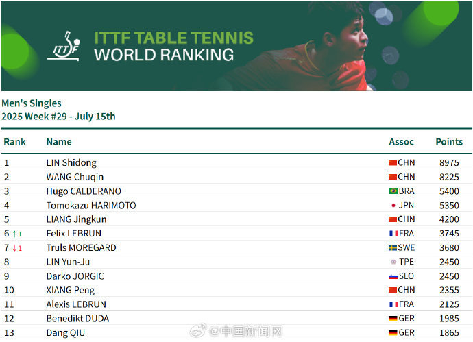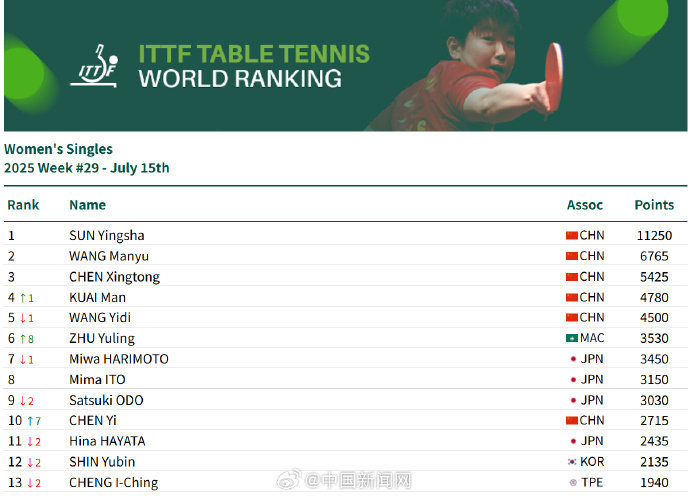 7月15日,世界乒联公布2025年第29周排名。女单方面,孙颖莎11250分保持第一,王曼昱 6765分第二,陈幸同5425分第三,朱雨玲3530分第六,较上周上升8位,陈熠2715分排名第十,较上周上升7位。男单方面,林诗栋8975分保持排名第一,王楚钦8225分排名第二,雨果5400分排名第三。