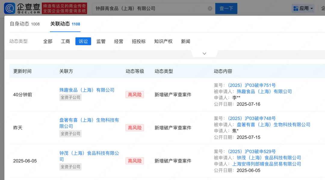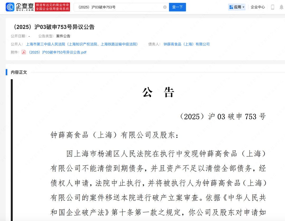 企查查APP显示,7月16日,钟薛高食品(上海)有限公司新增破产审查案件,申请人为上海臻料贸易有限公司,经办法院为上海市第三中级人民法院。据案件公告显示,因法院在执行中发现钟薛高不能清偿到期债务,并且资产不足以清偿全部债务,经债权人申请,法院中止执行,并将被执行人的案件移送进行破产立案审查。
