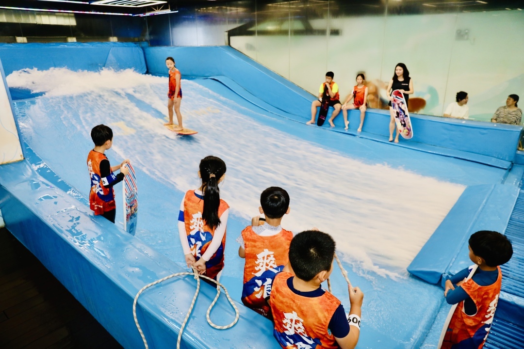 冯志东表示,海上冲浪受天气影响较大,对运动员的身体素质与冲浪技巧都有较高要求,而室内冲浪则能让冲浪爱好者在城市里就能随心所欲地体验冲浪的快乐。“目前不断有新学员加入进来,从体验中逐渐爱上冲浪运动。”他表示,冲浪池的表面柔软且富有弹性,人摔在上面并不会疼,学员们能在安全的前提下学习冲浪的基本知识,掌握力道、平衡等技巧,逐渐过渡到户外冲浪。