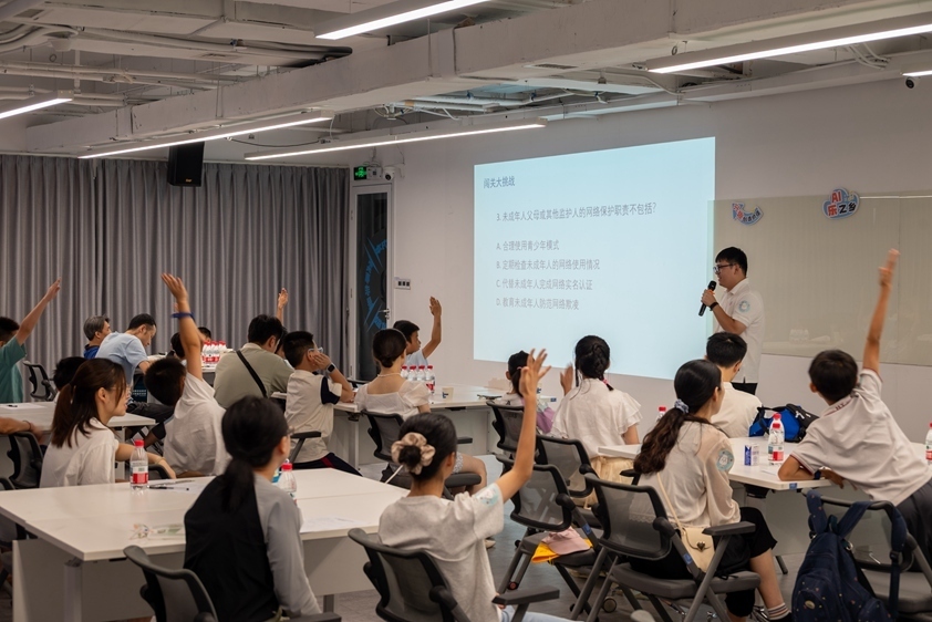 如果说AI音乐是用温暖的旋律滋养心灵,那么网络安全知识课程则为青少年的互联网生活披上 了“防护衣”。活动现场,网络安全领域的志愿者通过生动案例讲解青少年上网常见的风险,从保护个人信息到识别网络诈骗,再到合理安排上网时间,每个知识点都紧贴孩子们的生活场景。