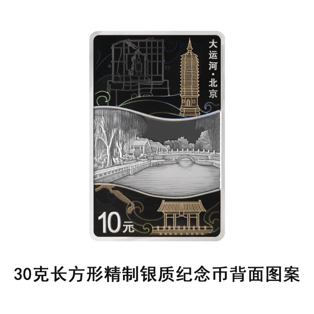 30克长方形银质纪念币背面图案以北京什刹海万宁桥为主要场景,衬以白浮泉、元代积水潭略图、燃灯塔、明清北京城平面图等,并刊“大运河·北京”字样及面额。