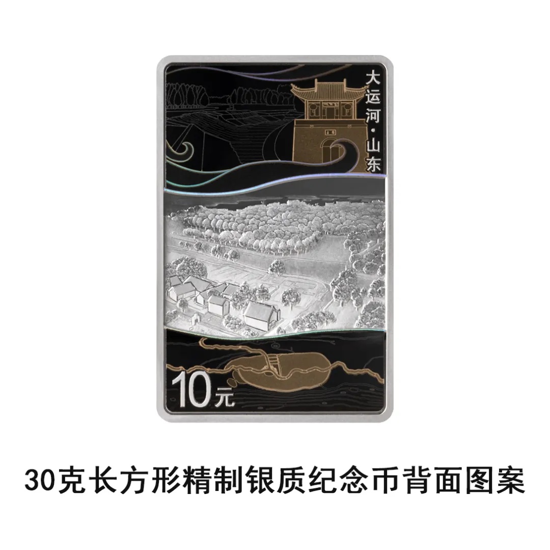 30克长方形银质纪念币背面图案以山东南旺分水枢纽遗址为主要场景,衬以戴村坝、临清鳌头矶、南旺分水枢纽古地图等,并刊“大运河·山东”字样及面额。