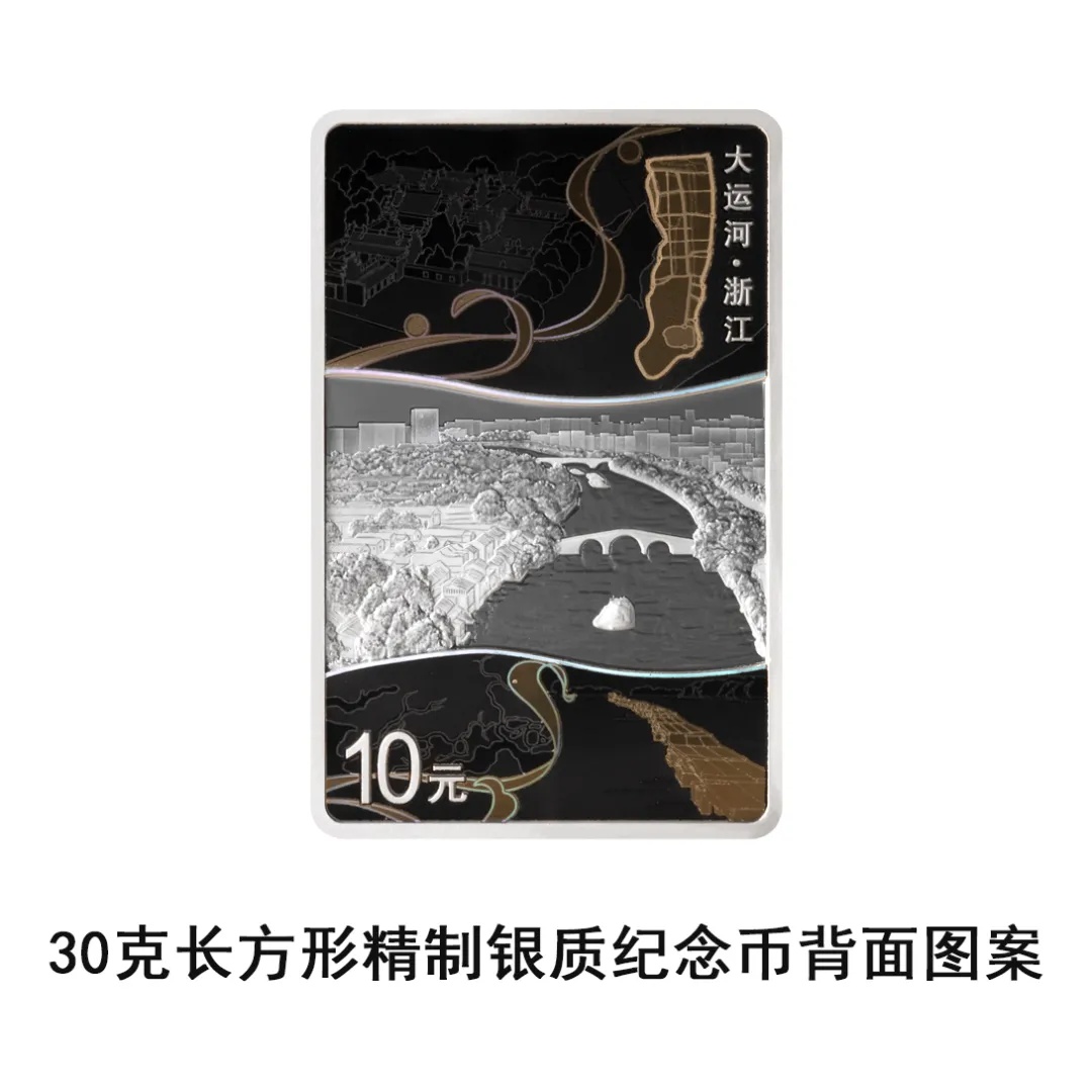 30克长方形银质纪念币背面图案以浙江杭州拱宸桥及历史文化街区为主要场景,衬以绍兴古纤道、宁波庆安会馆、南宋临安城平面图、浙东运河古地图等,并刊“大运河·浙江”字样及面额。