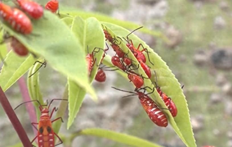 这些红色虫子颜色鲜红,腹部有白色斑,后背有两个明显的黑色翅,短的不足1厘米,最长的约2厘米,大部分虫子都攀附在草叶上或聚集在路边。
