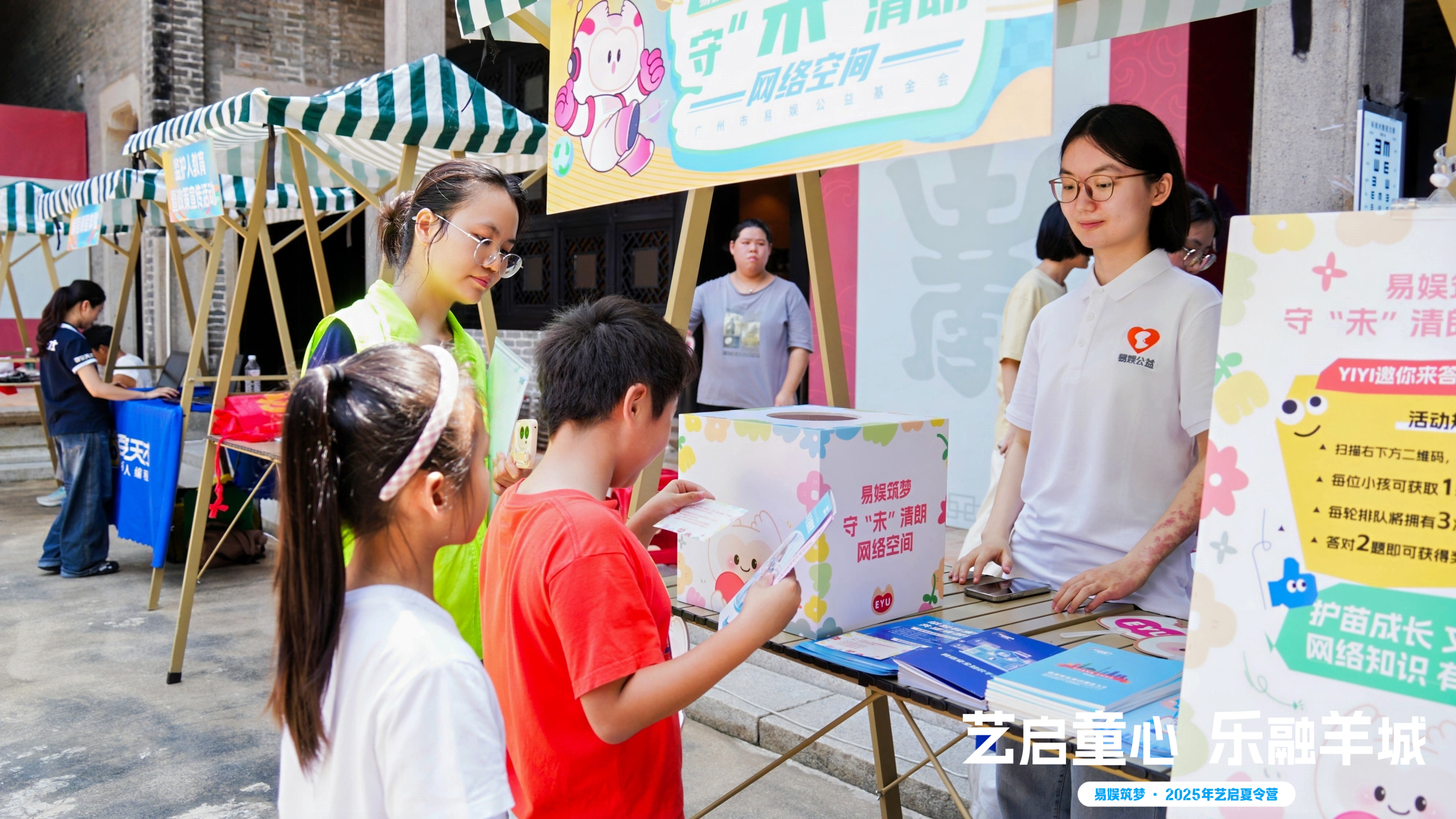 林和街举办“艺启童心 乐融羊城——易娱筑梦・2025年艺启夏令营”活动。夏令营设置了导赏参观、非遗文化体验、科技体验、儿童眼科义诊、游戏互动等环节。在专业导师、社工和志愿者带领下,小朋友们探寻了刘氏家庙的非遗文化,与家长协力合作完成了烧箔画作品,互相分享了成果。家长们表示“不仅让孩子零距离感受到了非遗的独特魅力,锻炼了小朋友的动手能力和专注力,增进了对传统文化的理解,非常有意义!”