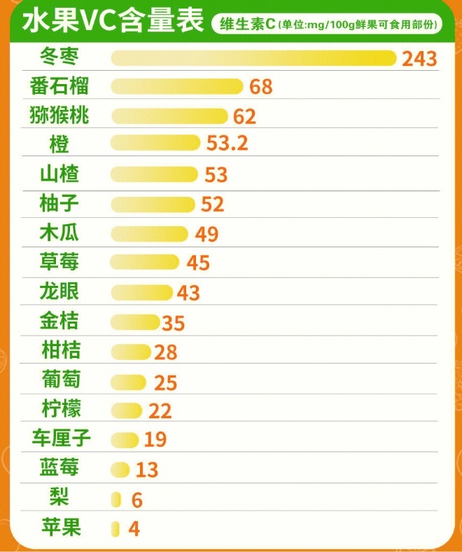 常规水果中的维C王者是冬枣,100g冬枣维C高达243mg,一天只要吃2-3颗就可以了,价格不贵,堪称水果界的良心之选。