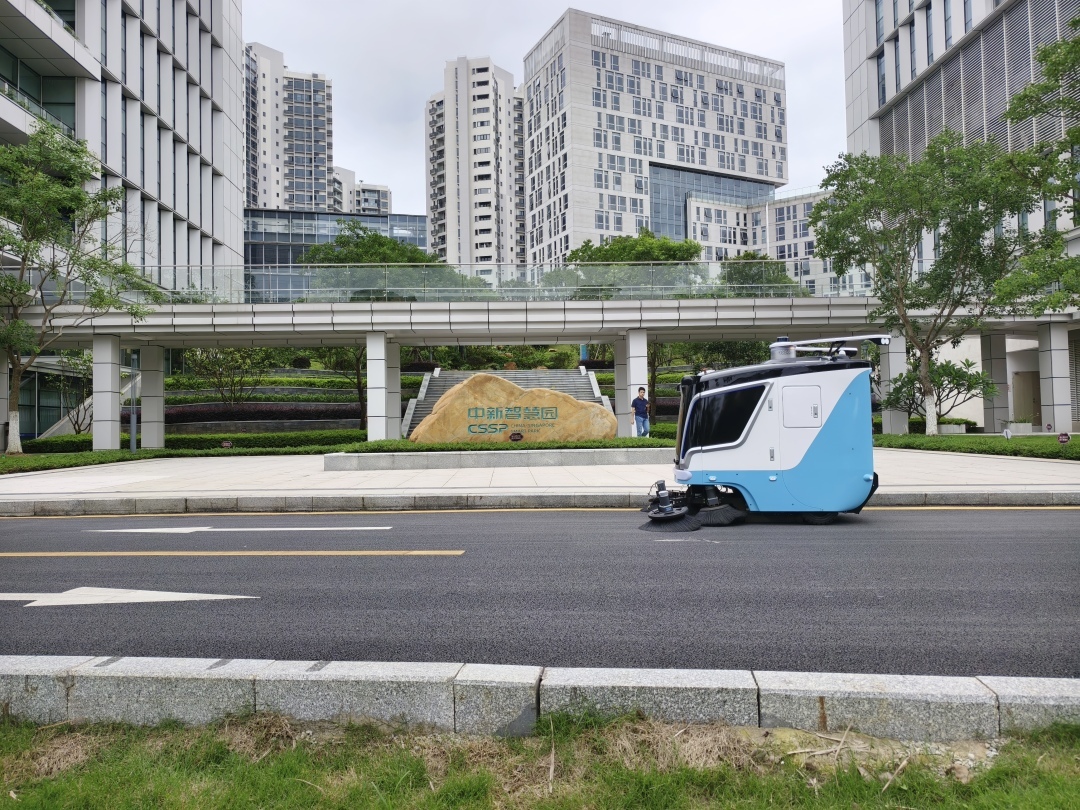 赛特智能S3无人驾驶清扫车在园区内作业。