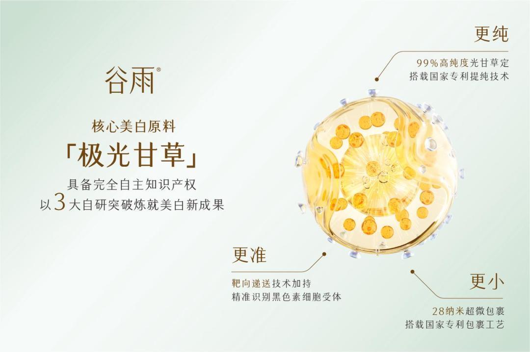 以极光甘草为例,谷雨通过自主研发的双专利技术——“熔融结晶提纯技术”及“28纳米包裹体技术”,成功将光甘草定的纯度提升至99%,达到行业最高水平。同时,通过靶向递送技术,实现了光甘草定在皮肤中的精准释放,显著提升了美白效果。这一具备完全自主知识产权的创新成果,不仅让极光甘草成为谷雨的“明星”成分,还推动了光甘草定这一中国特色植萃成分在国际化妆品舞台上的广泛认可。