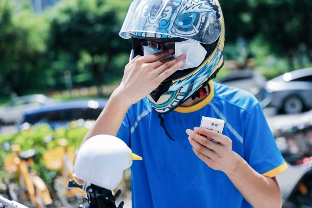 连日高温炙烤下,户外劳动者的清凉需求备受关注。闪送骑手黄师傅把电动车停在树荫下,摘下头盔的瞬间,汗水如溪流般淌下,瞬间模糊了视线。“头盔里像蒸笼,汗流进眼睛就看不清路了,一小时不擦一次根本顶不住。”这位跑了4年的老骑手苦笑着,蓝色工装后背早已洇开大片深色的汗渍。他匆忙掏出一包纸巾,用力擦拭着脸颊和脖颈。