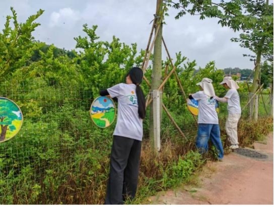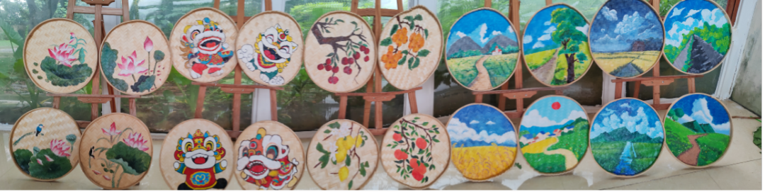 为打造“一步一景”的乡村美学空间,实践团队以“农文旅融合”为核心理念,广告专业的同学充分发挥艺术创造力,用彩色竹编工艺制作了“西塘童话小镇”的艺术品字幅悬挂在景区道路醒目处,与自然景观相融合,并以传统簸箕为创作载体,精心绘制了20幅展现“自然风光、非遗醒狮、传统文化”三大主题的艺术作品。这些融合传统工艺与现代审美的创意作品,不仅丰富了乡村的文化表达形式,更让传统文化焕发出新的生机与活力。村民张大爷感慨:“这些画让村里老墙活过来了,现在城里人都来打卡拍照!”