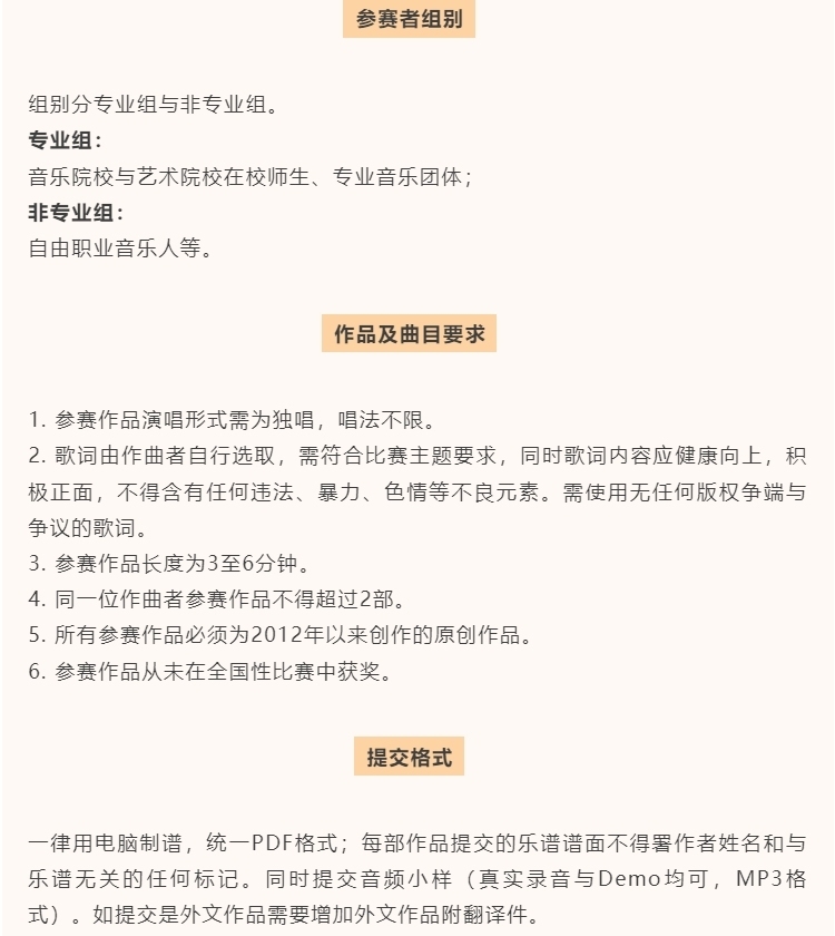 4.参赛作品还应具有积极健康的思想内涵,鼓励创作者从多元的文化视角、生活感悟、情感体验等方面汲取灵感,展现丰富的人文精神与艺术情怀,以独特的音乐叙事塑造深刻而动人的艺术形象。