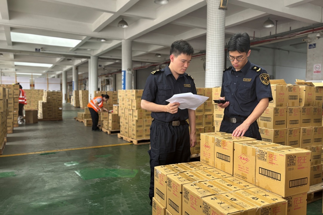 萝岗海关关员在黄埔全球供应链中心对货物实施监管。