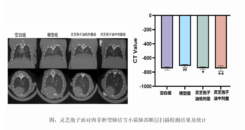 研究结果证明:灵芝孢子油显著减少了肺部肉芽肿结节的面积和磨玻璃阴影,减少炎症因子和趋化因子,有望成为治疗肺结节的潜在药物。