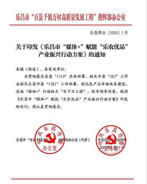 记者今天了解到,广东省韶关乐昌市近日正式出台“媒体+”赋能农业全产业链实施方案——《乐昌市“媒体+”赋能“乐农优品”产业振兴行动方案》,成为广东省首个出台此类方案的县(市/区)。方案旨在通过“媒体+” 行动助力“百千万工程”,全面赋能“乐农优品”产业,全链条激活乡村振兴动能。方案已于7月15日由乐昌市“百县千镇万村高质量发展工程”指挥部办公室和中共乐昌市委宣传部联合下发。
