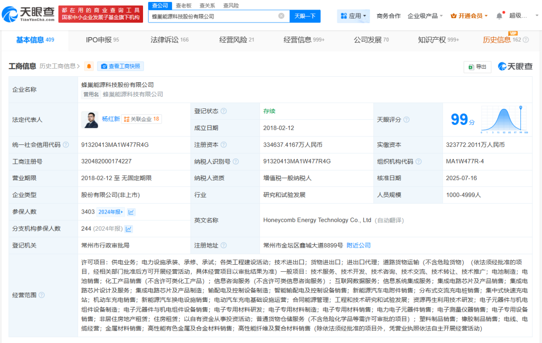 记者从天眼查App获悉,近日,蜂巢能源科技股份有限公司发生工商变更,注册资本由约32.43亿元人民币增至约33.46亿元人民币,增幅约3.18%。