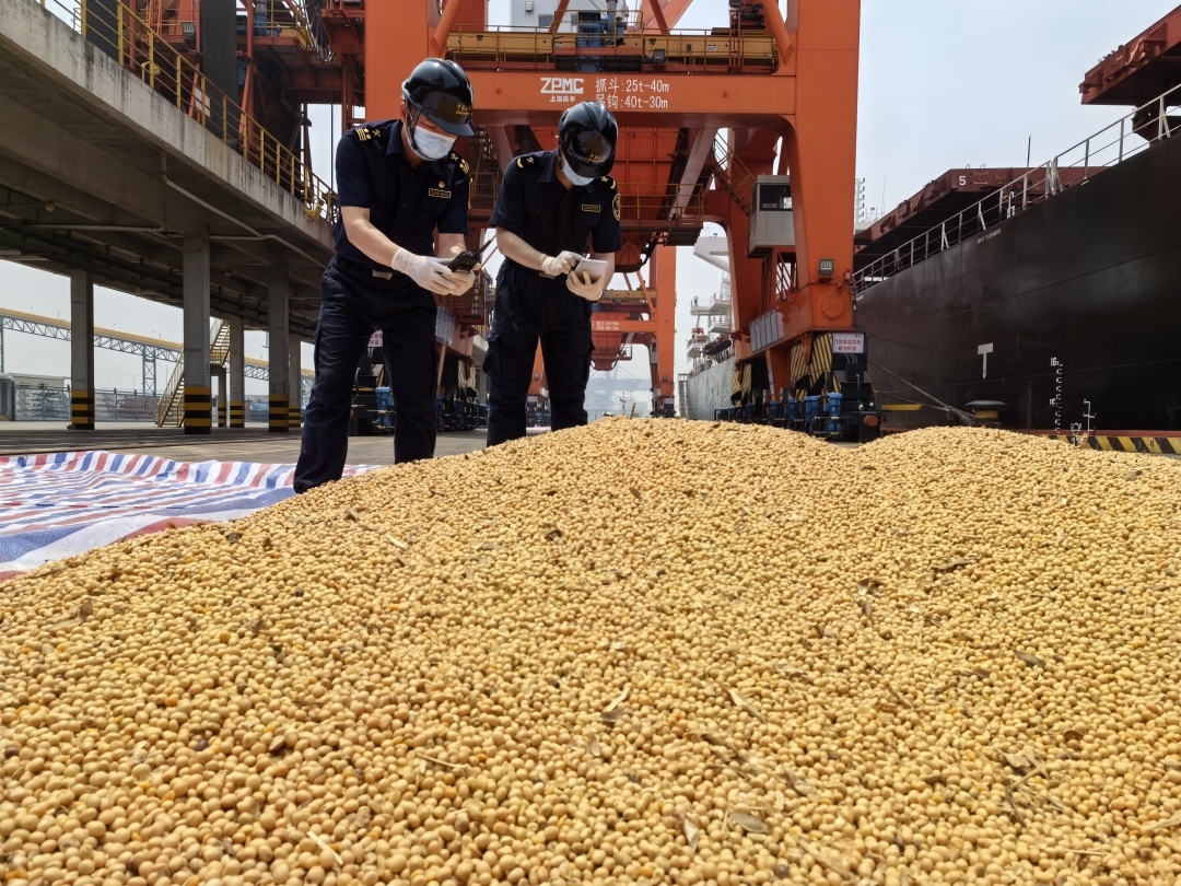 图说:新沙海关关员对中粮码头首艘进口大豆开展查验工作。