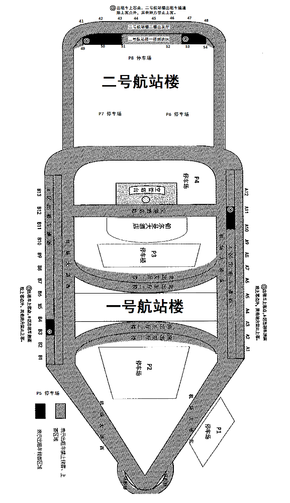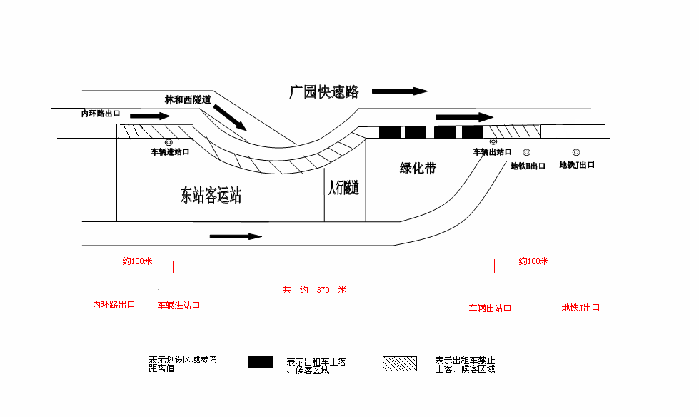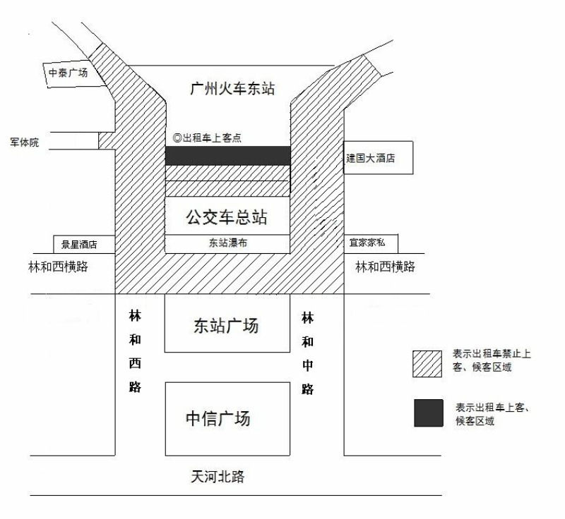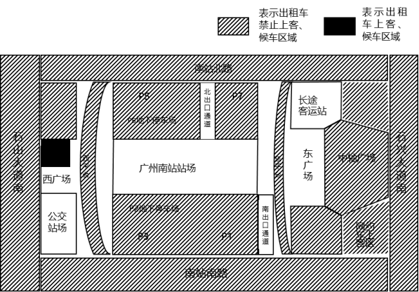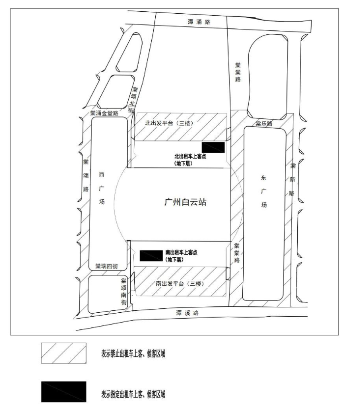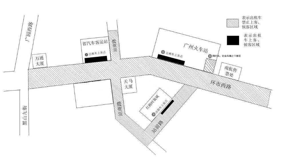 斜线、黑色区域为巡游出租汽车运营站点及周边区域,黑色区域为巡游出租汽车专用候客、上客区。斜线区域内,巡游出租汽车下客后应马上离开,不得逗留候客、上客。