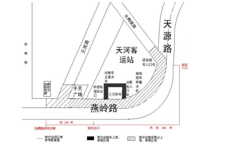 斜线、黑色区域为巡游出租汽车运营站点及周边区域,红线表示为划设区域参考距离值,黑色区域为候客区和上客点。斜线区域内,巡游出租汽车下客后应马上离开,不得逗留候客、上客。