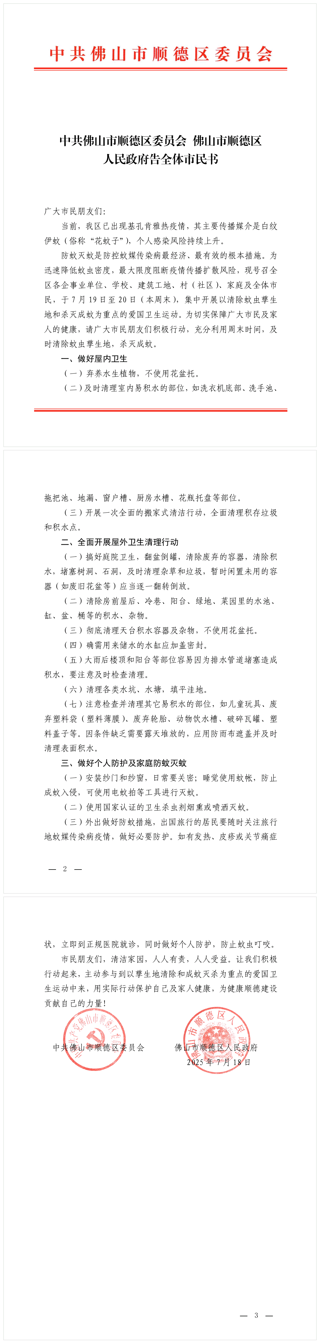 该告全体市民书表示,为迅速降低蚊虫密度,最大限度阻断疫情传播扩散风险,现号召全区各企事业单位、学校、建筑工地、村(社区)、家庭及全体市民,于7月19日至20日(本周末),集中开展以清除蚊虫孳生地和杀灭成蚊为重点的爱国卫生运动。“请广大市民朋友们积极行动,充分利用周末时间,及时清除蚊虫孳生地,杀灭成蚊。”