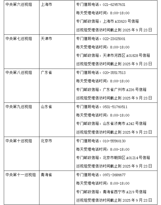 根据党中央关于巡视工作的统一部署,近日,二十届中央第六轮巡视的16个巡视组陆续开始进驻被巡视地区,并公布了联系方式。