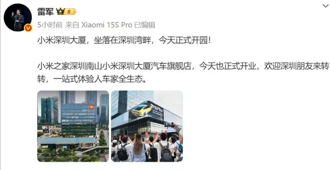 7月18日,小米深圳总部正式开园。小米深圳大厦坐落于深圳南山区后海金融商务区的核心区域,总建筑面积为4.6万平方米,毗邻深圳人才公园、深圳湾万象城、华润大厦等标志性建筑。小米集团创始人雷军也在社交媒体上发文“小米深圳大厦,坐落在深圳湾畔,今天正式开园!小米之家深圳南山小米深圳大厦汽车旗舰店,今天也正式开业,欢迎深圳朋友来转转,一站式体验人车家全生态。”