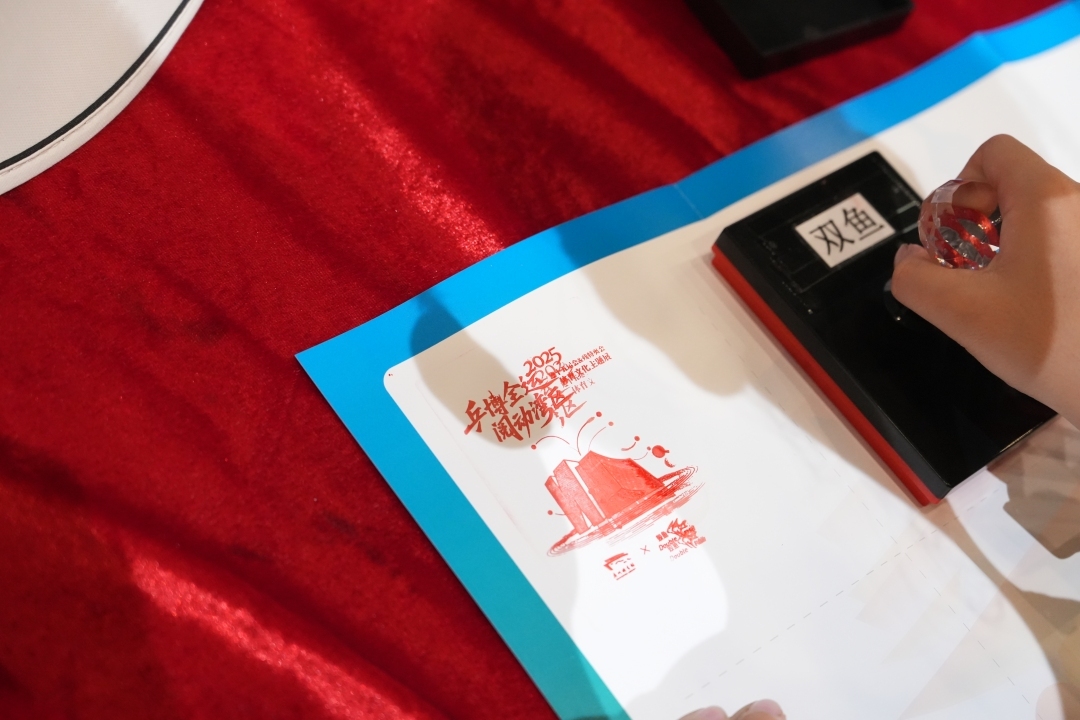 在多个互动打卡点中,“有球必应”体验活动备受瞩目。展厅内设有乒乓球台和自动发球机,读者可现场体验接发球,还有机会抽奖获得广州图书馆和广州双鱼体育用品集团有限公司联名款精美周边,包括乒乓球套装、盲盒钥匙扣、迷你球拍、“穗阅一家人”IP主题乒乓球等。现场还摆放了全运会主题展刊,以折页形式呈现,一面展示全运会时间轴,一面设计为运动IP集章打卡页,方便读者参与馆内多处盖章体验。