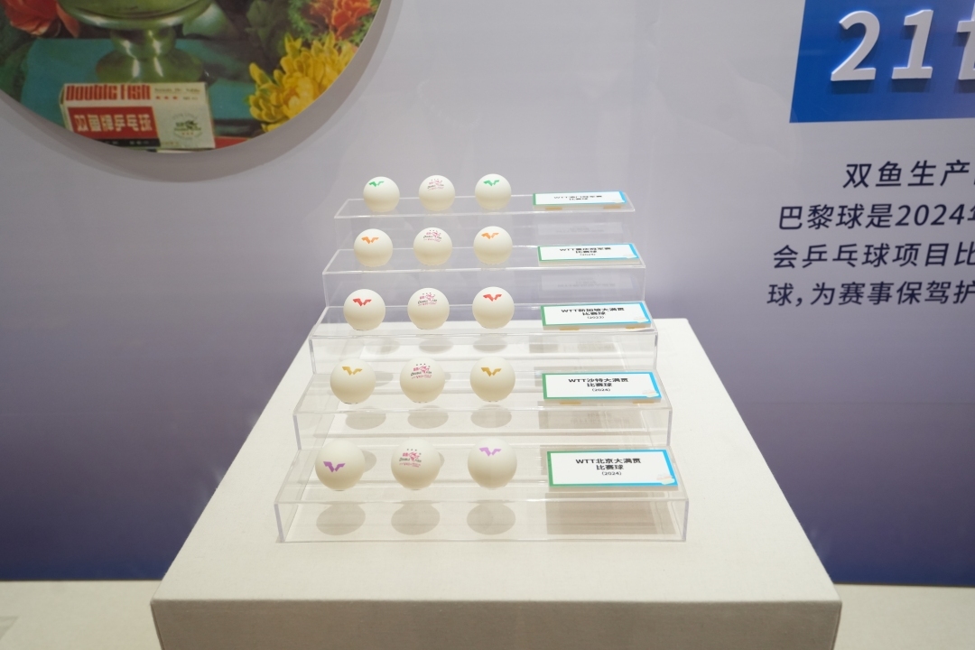“乒竞全历”展区内容同样丰富,既能了解乒乓球器材进化的工艺历程,也有众多珍贵展品展出。其中,十五运会乒乓球指定用台——双鱼全运版“展梦3”乒乓球台更是首次向公众展出。此外还有电影《中国乒乓》联名签名礼盒,珍藏版双鱼赛事用球及纪念球,如2008年北京奥运会纪念球以及2021年第十四届全运会、2024年巴黎奥运会等比赛用球。