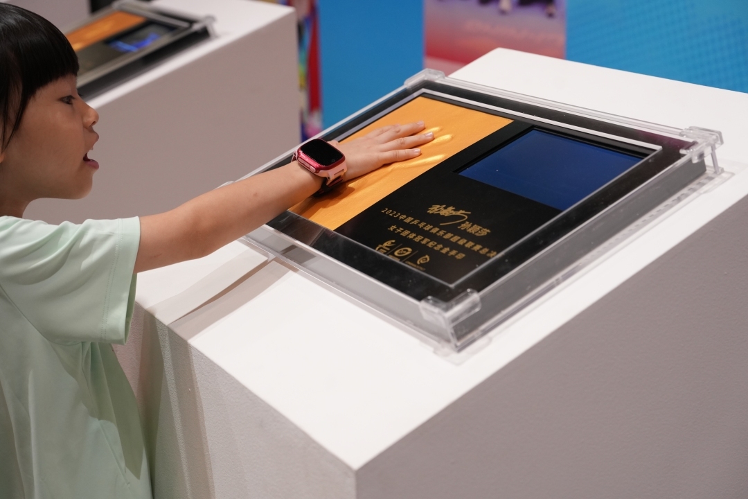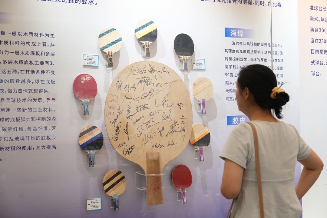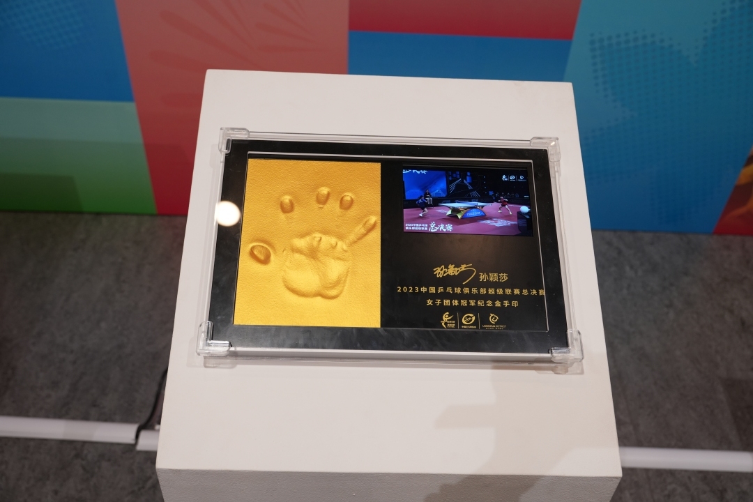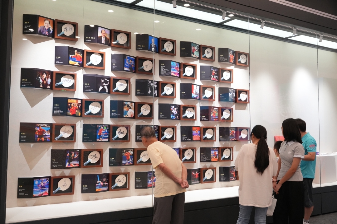 踏入展厅,一面极具视觉冲击力的展示墙瞬间抓住读者目光,这是汇聚了32个乒乓球冠军的签名球拍墙。邓亚萍、张怡宁、刘国梁、王皓、马龙、丁宁、孙颖莎、王楚钦等一众乒坛巨星的名字皆在眼前,熠熠生辉。在这个被命名为“荣耀殿堂”的展区中,读者不仅可以寻觅自己喜爱运动员的专属印记,与承载着偶像荣耀与汗水的签名球拍合影留念,还可以零距离与冠军“击掌”——马龙、孙颖莎、刘诗雯、陈梦等4位乒乓球奥运冠军的金手印成为本展区的重磅亮点,跨越时空的界限,感受拼搏进取的体育精神。